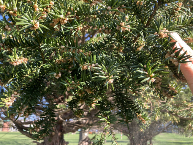 風が吹くと、木が揺れてこの小さい種子の実の部分から大量の花粉が飛んでいました!