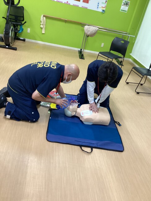 職員が順番に気道確保、胸骨圧迫、人口呼吸の訓練を行ないました。
