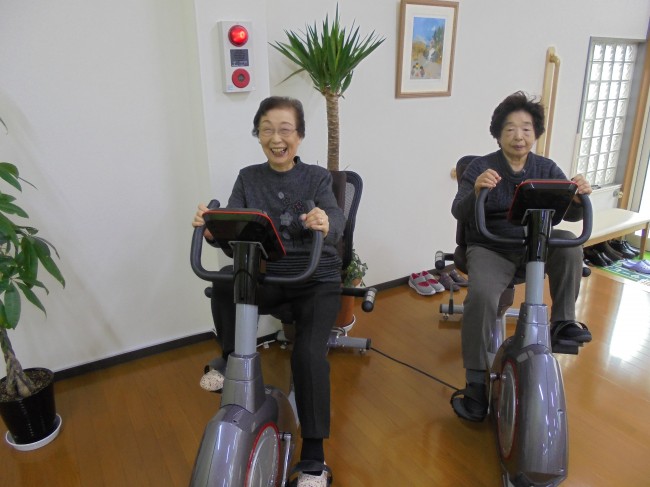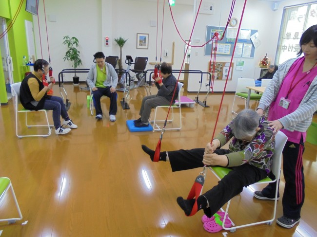 下の利用者様は、足首におもりをつけて不安定な台の上をランダムに歩く訓練をしています!